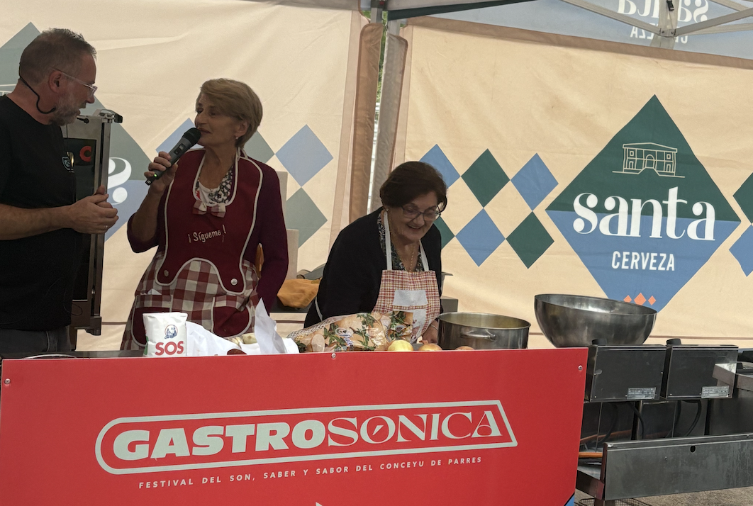 Dos de las protagonistas del proyecto de recuperación de la memoria gastronómica de Lluis Nel en Parres, María González Llerandi y Carolina Cayarga Pintado, ambas de Llames de Parres, una aldea de 80 vecinos, cocinaron en el festival platos de su día a día como el tortu con queso para desayunar, que recuerda, sin duda, a la arepa con queso que se podría tomar en Venezuela o Colombia.