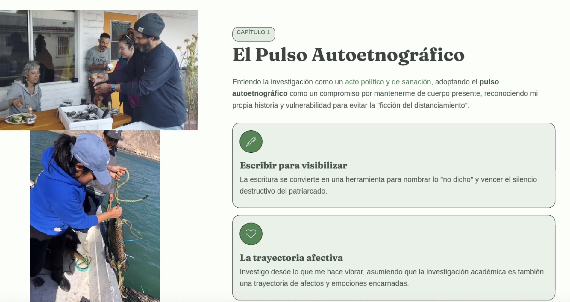 Es por ello que considera su investigación como «un acto político y de sanación» y propone una metodología «sopa de piedra», metáfora de la investigación colaborativa con una escritura a muchas manos», puesto que le parece «más honesto que la escritura de solo un lugar, desde una posición de poder». Además reivindica una resistencia hacia la distancia académica, para evitar dejar el conocimiento encerrado en artículos académicos.
